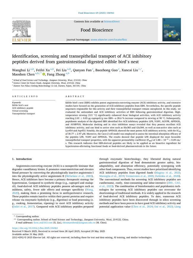 ②Identification, screening and transepithelial transport of ACE inhibitory peptides derived from gastrointestinal digested edible bird's nest[J]. Food Bioscience, 2025: 106961.