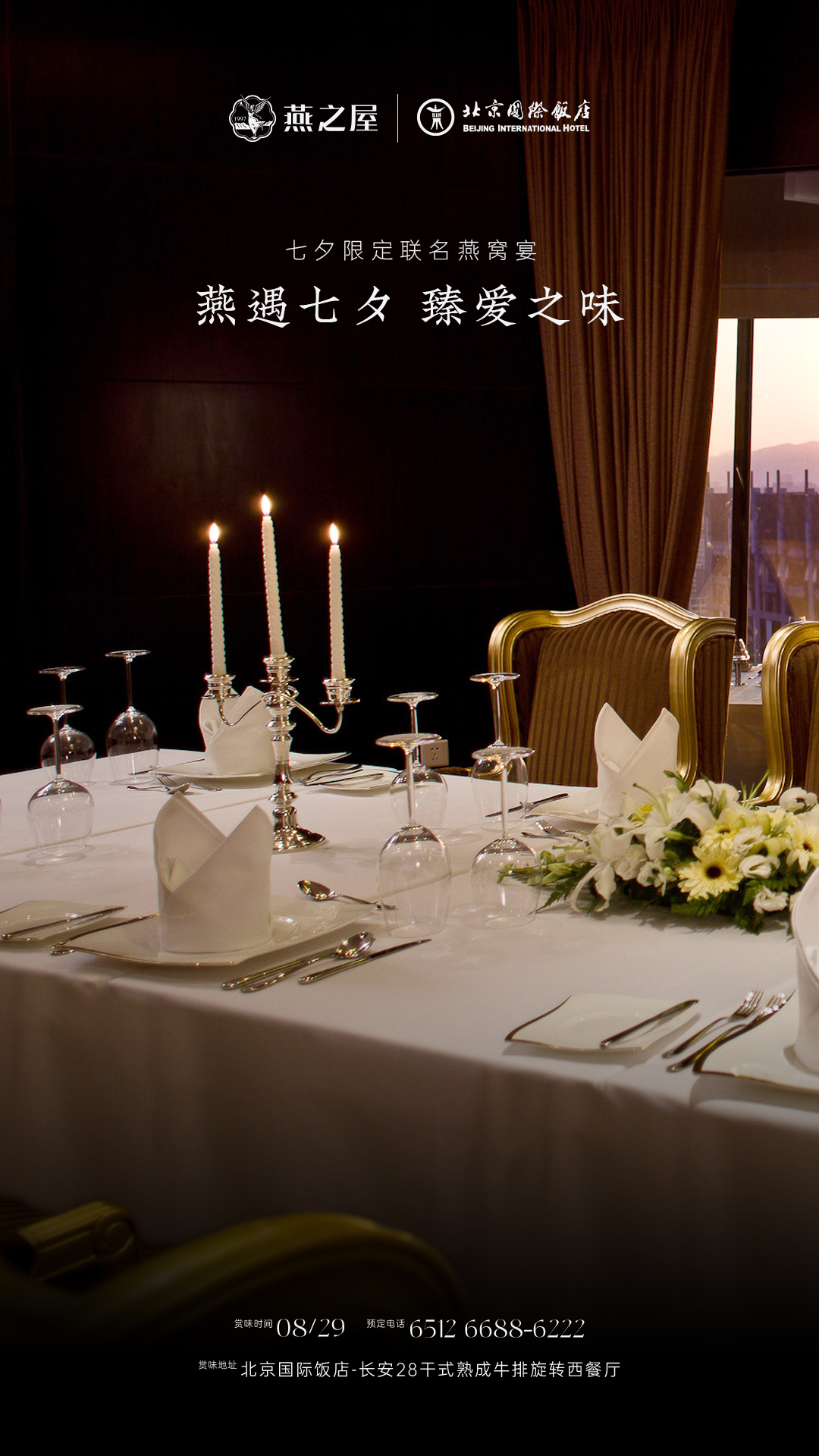 北京國際飯店長安28餐廳作為北京市中心高空360度環(huán)瞰京城盛景的旋轉(zhuǎn)餐廳,以其獨特的奢華與雅致并存的裝修風(fēng)格,成為京城高端餐飲場所。604㎡餐廳空間、100個精致餐位,3間多功能廳房,配合專業(yè)的服務(wù)團隊,為每位賓客提供尊貴的用餐體驗。燕之屋27年專注高品質(zhì)燕窩,始終堅持“源于天然,美與健康”的理念,以創(chuàng)新科研賦能上乘品質(zhì),連續(xù)九年高端燕窩全國銷售第一①。此次合作是云端視野與輕奢品味的雙重尊享,正如每一對相約七夕的甜蜜愛侶。